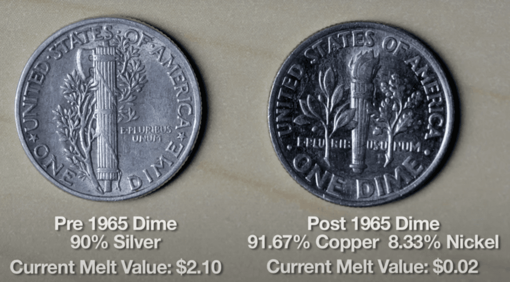 • U.S. Dime – prior to 1965 was composed of 90% silver, 10% copper; whereas since 1965 it is composed of 91.67% copper and 8.33% nickel in the form of a pure copper core surrounded by a cupronickel plating of 75% copper 25% nickel.